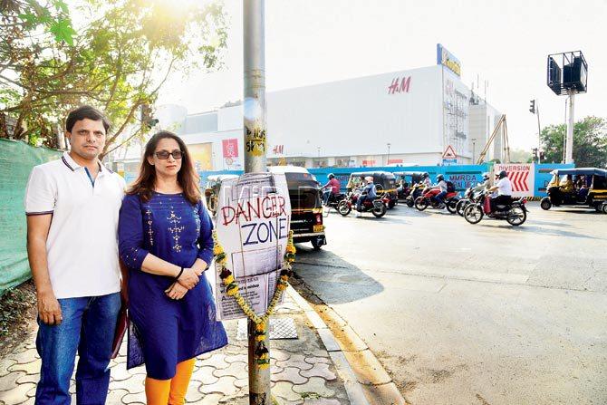Swapna Sankhe and her brother Gitesh have been putting up posters near their mother’s (inset) accident site near Inorbit Mall Junction, Link Road in Goregaon, to alert commuters and residents. Pic /Satej Shinde