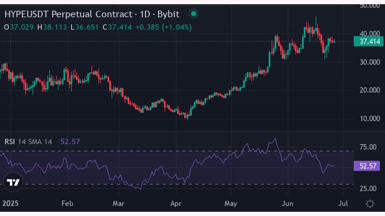 The current price range of HYPE is between $29.19 and $44.09. This places it close to its 10-day and 100-day simple moving averages, which are $37.40 and $36.50 respectively. The relative strength index stands at 49.34, which is near the neutral zone, indicating neither overbought nor oversold conditions. The stochastic value of 59.21 supports this neutral stance.