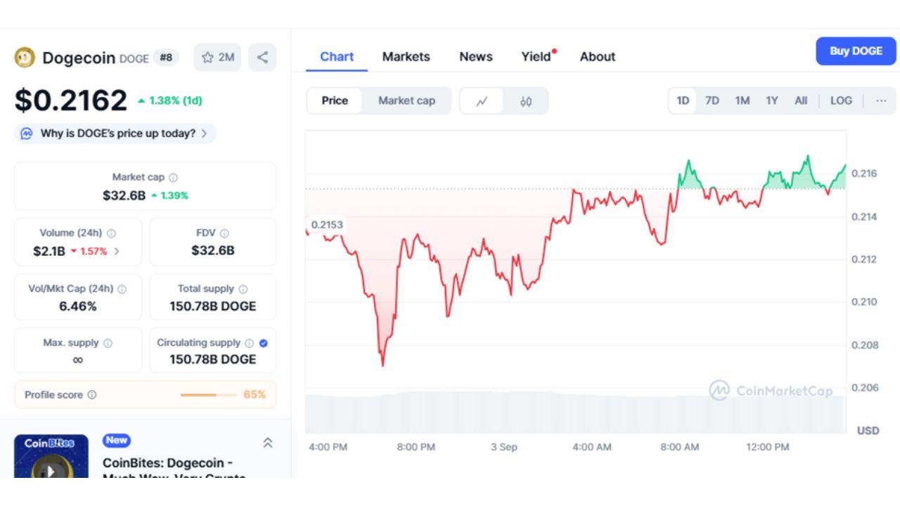 Dogecoin is currently priced at $0.2162 with a market cap of $32.6 billion. According to CoinMarketCap, the circulating supply is 150.78 billion DOGE and daily trading volumes are over $2.1 billion.