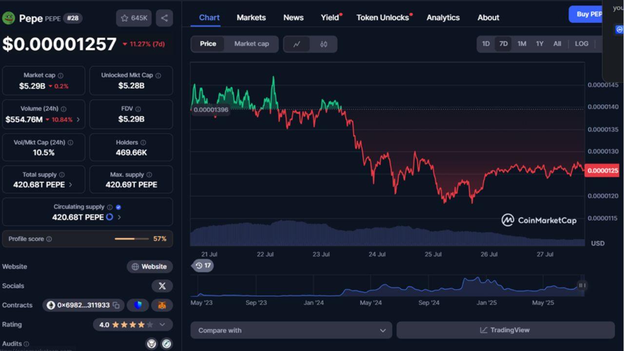 PEPE trades at $0.00001257 today, with a market cap of $5.29 billion and a 24‑hour volume of $554 million. That follows a 0.22 % uptick in the last 24 hours but a 9.6 % slide over seven days.