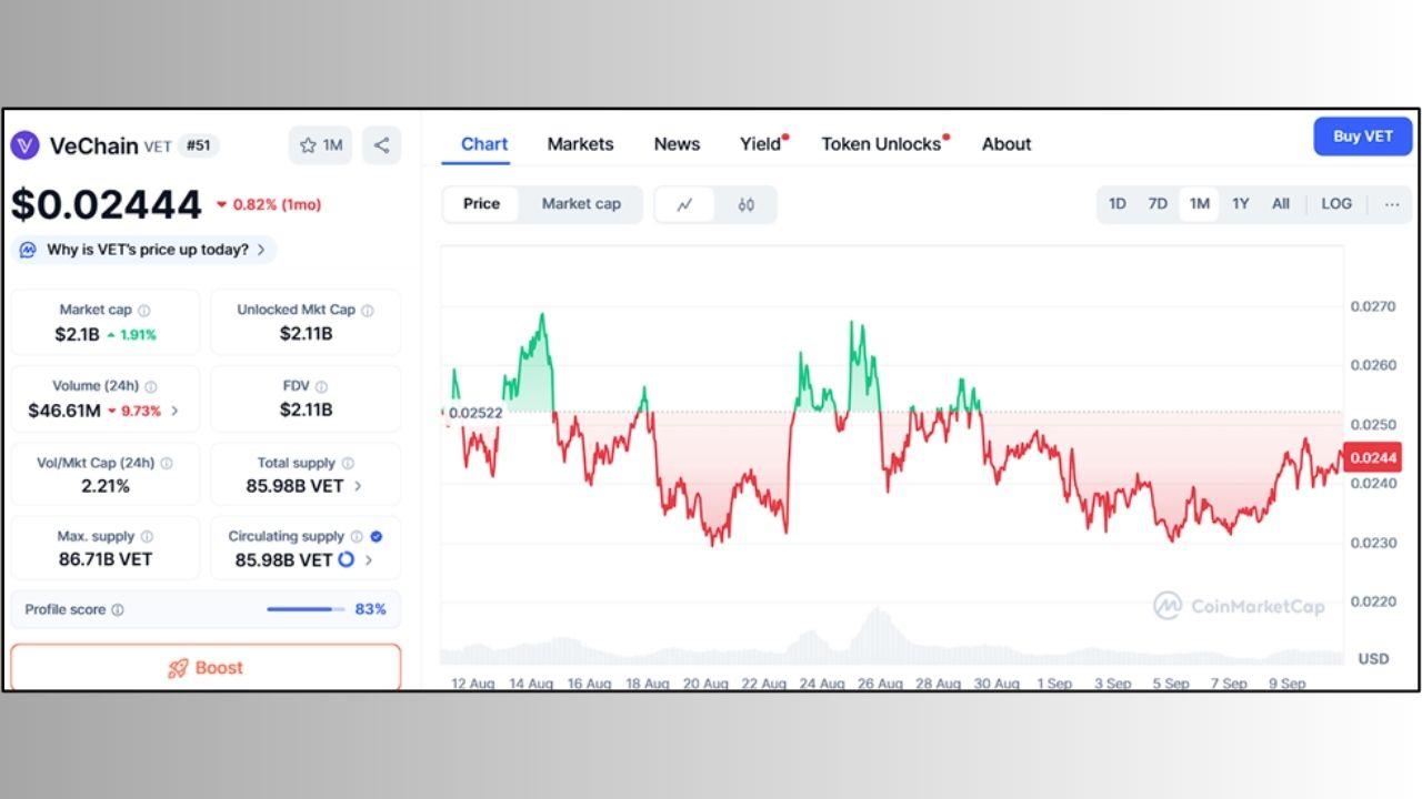VeChain (VET) has earned strong popularity as a blockchain platform built for supply chain management and company adoption. Trading around $0.0244, VET has shown resilience in 2025 as it continues to expand partnerships and improve real-world use cases. Analysts are optimistic about its ability, with projections suggesting that VeChain should deliver as much as a 20× return if broader adoption accelerates in the coming years.