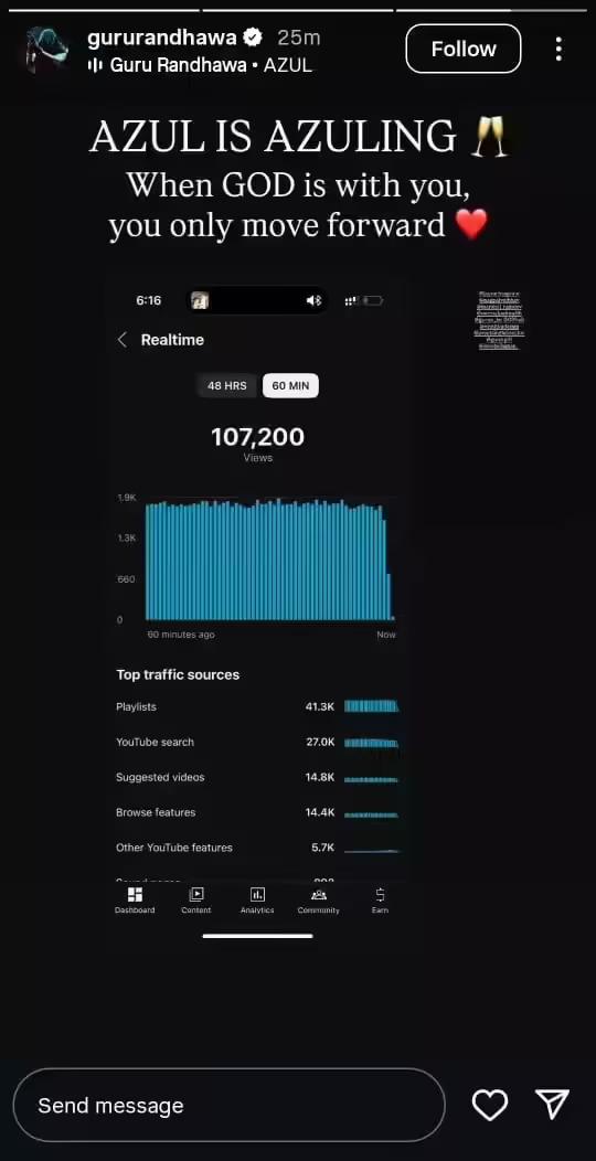 Guru took to his Instagram stories on Friday and shared a screenshot of the statistics of his new song Azul. The screenshot indicated that the song was trending with over 107,200 views in the last hour and had over 27,000 searches on YouTube.