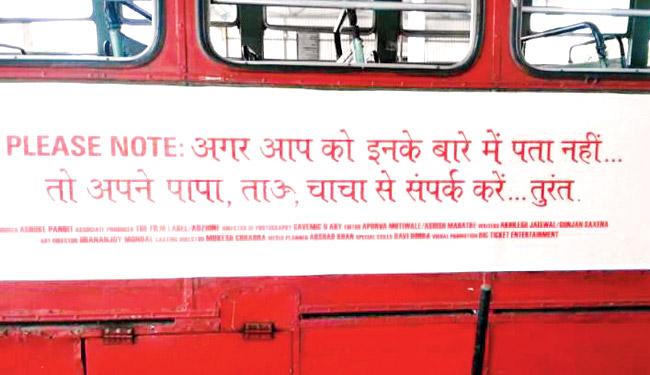 It seems that Mastram’s advertising agency had booked around 100 BEST buses for promoting the film. BEST is said to charge around Rs 10,000 per bus; this means that producer Sunil Bohra has already paid them Rs 10 lakh for his film’s promotion. And while Bohra says that he has already made the required changes, a source close to the agency says, “Taking heed of the objections that have been raised, we have now put up white stickers on these buses in order to block out these lines.”