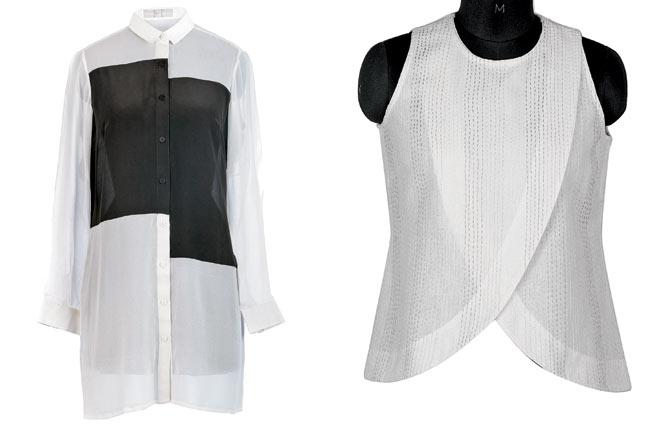 Left: Monochromatic shirt (R7,250). LOG ON TO www.nete.in. Right: Wrap-over top in khadi with gudri embroidery (R2,990). AT Fabindia, Juhu