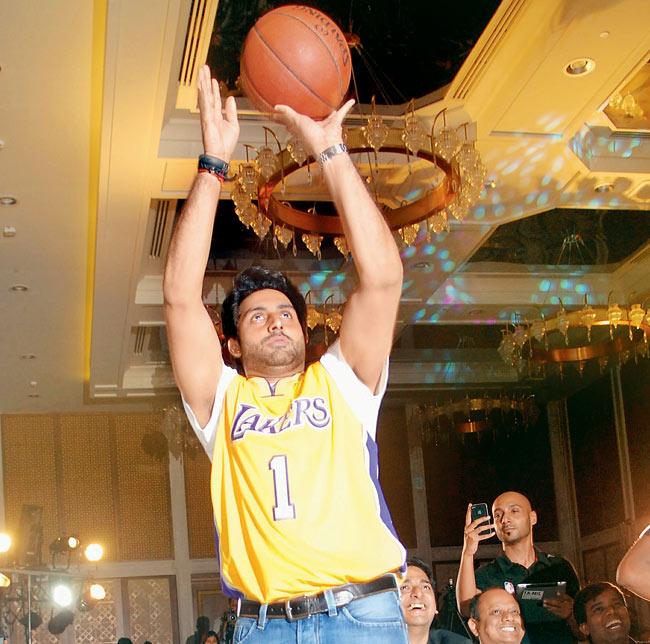 Abhishek Bachchan tries to basket the ball at a promotional event. Pic/Shadab Khan