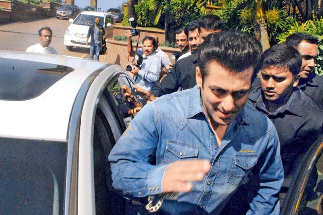 Salman Khan appeared to be in a tearing hurry on the way to an event in Bandra. Fashionably late or was it just to get through the paparazzi? Whatever the reason, the star rushed in, jangling his trademark bracelet. PIC/ SHADAB KHAN