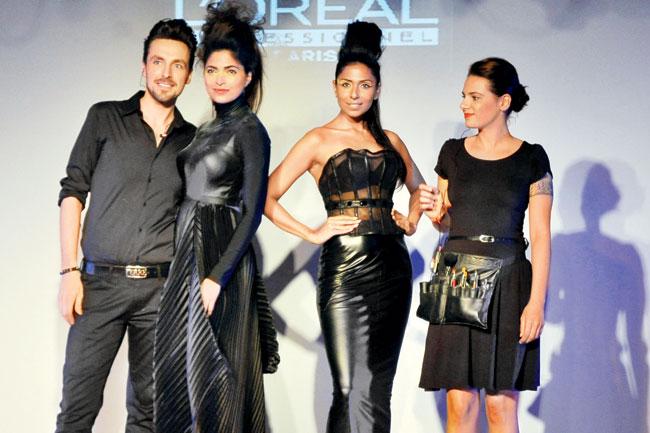 (L-R) Loic Chapoix ( Artistic Hair Director Dessange Mumbai), Parvathy Omanakuttan (Model), Candice Pinto (Model), Fanny Aubin (Makeup Director Dessange Mumbai)