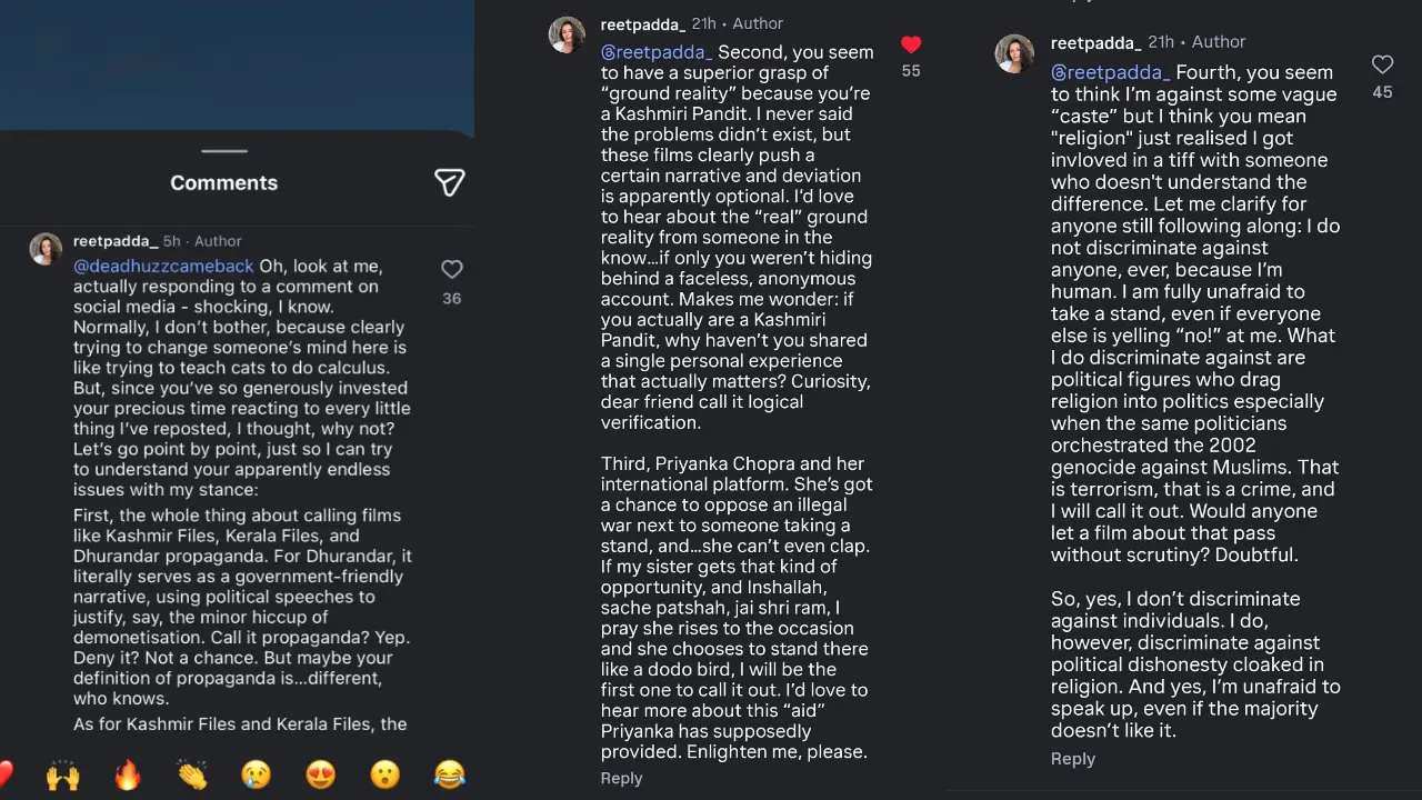 Reet was responding to a comment on her post that called her out for labelling films like Dhurandhar 2, The Kerala Story, and The Kashmir Files as propaganda. The user also questioned her criticism of Priyanka Chopra for not reacting when her co-presenter at the Oscars stood up for Palestine.