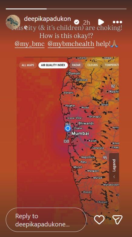 Deepika posted a screengrab of Mumbai's pollution levels. Expressing concern about the situation in the city, the actor wrote that the people living in Mumbai, especially children, are struggling to breathe due to the worsening air quality. Her post read, "The citizens of this city and its children are choking! How is this okay!? @my_bmc | @mybmchealth please help!"
