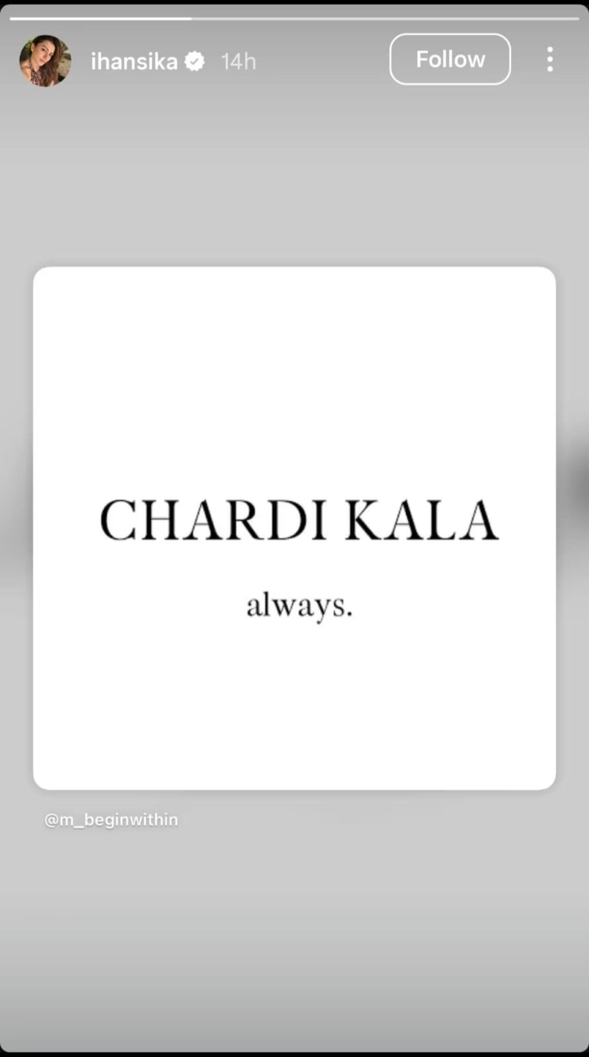 On Thursday, 12 March, Hansika Motwani took to her Instagram Stories to share a short note on positivity and resilience.