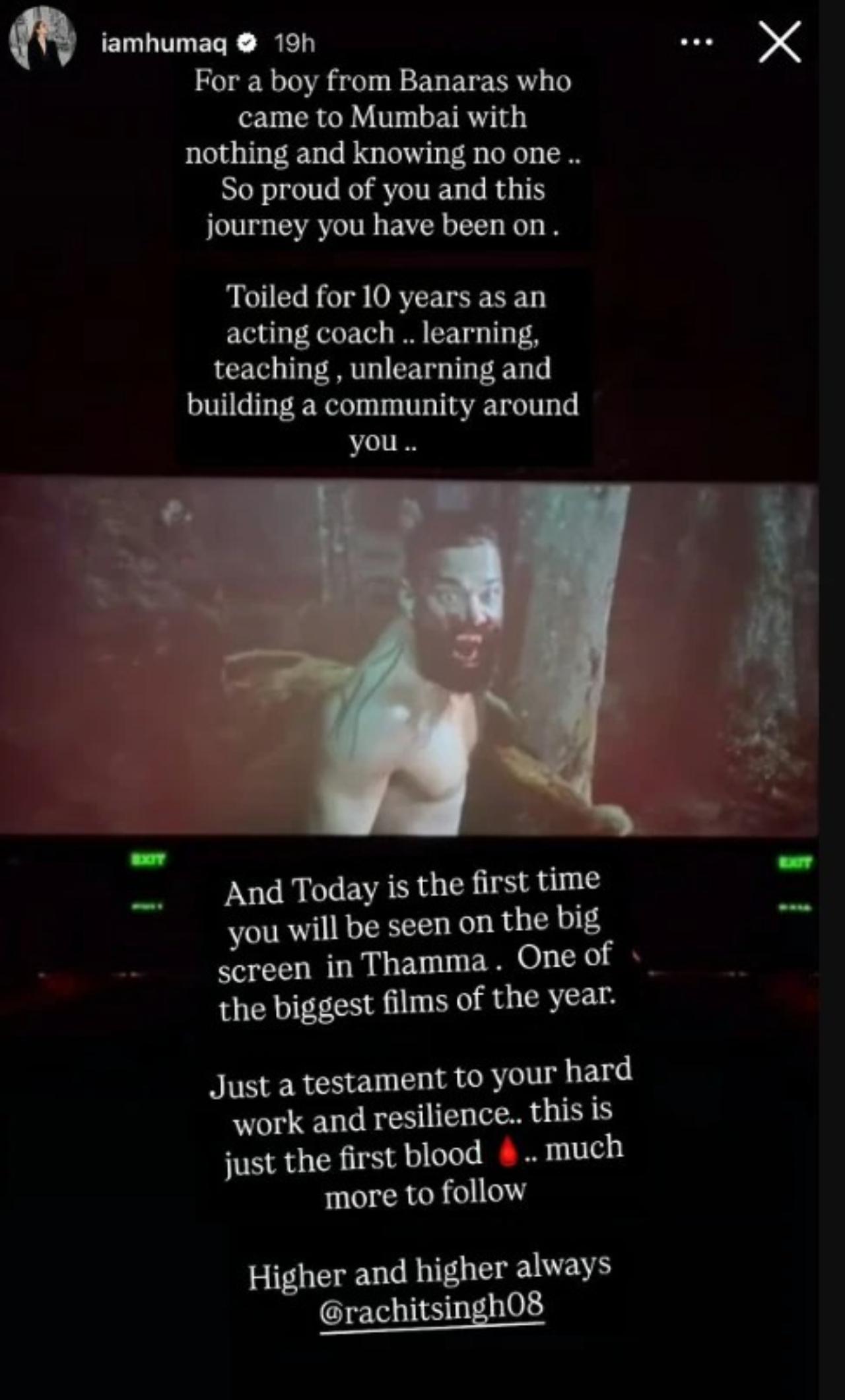 Actress Huma Qureshi has showered praise on her rumoured partner Rachit Singh for his big-screen debut with Thamma. The actress took to her Instagram Stories and shared a still featuring Rachit from the horror-comedy. She expressed her pride in Rachit and spoke about his 10-year struggle to reach where he is.