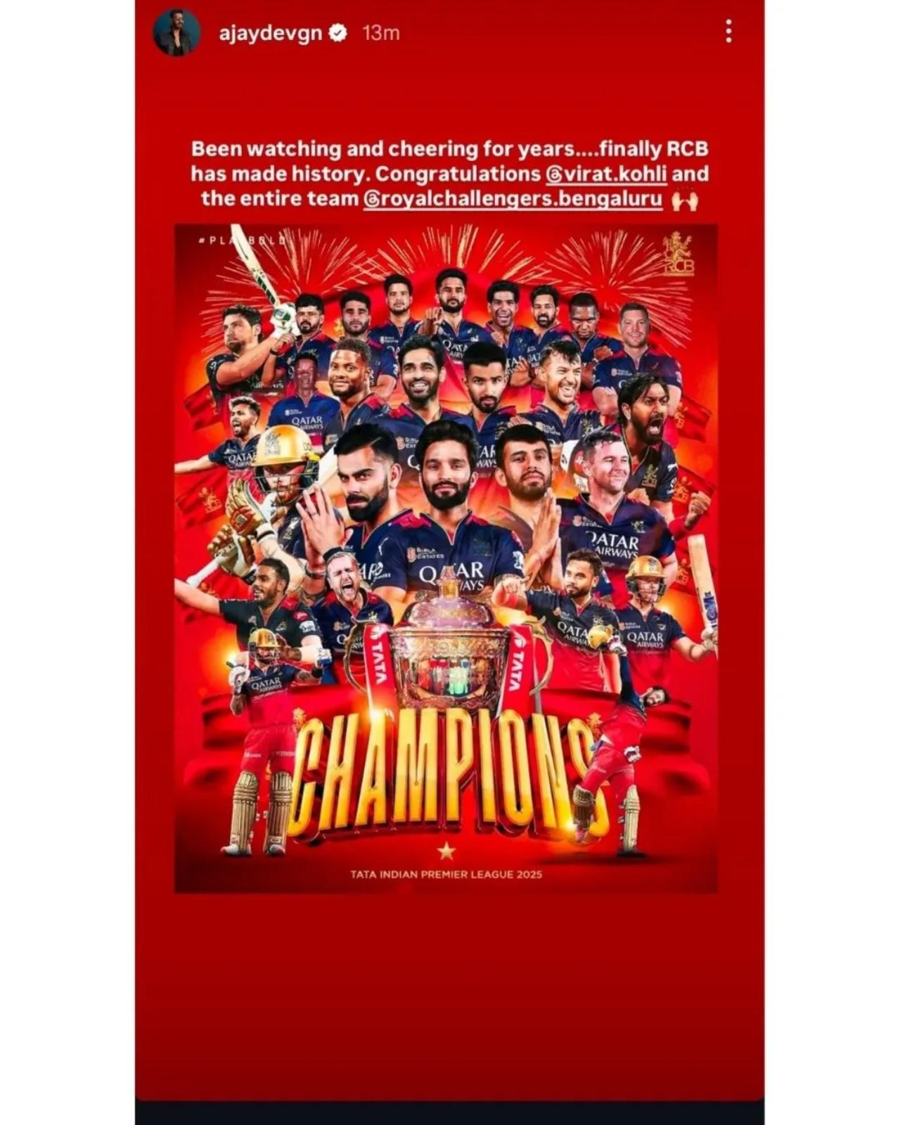 It was a historic moment as Virat Kohli's RCB won their maiden IPL title after 18 years of wait. Congratulatory messages poured in for the team from the film industry