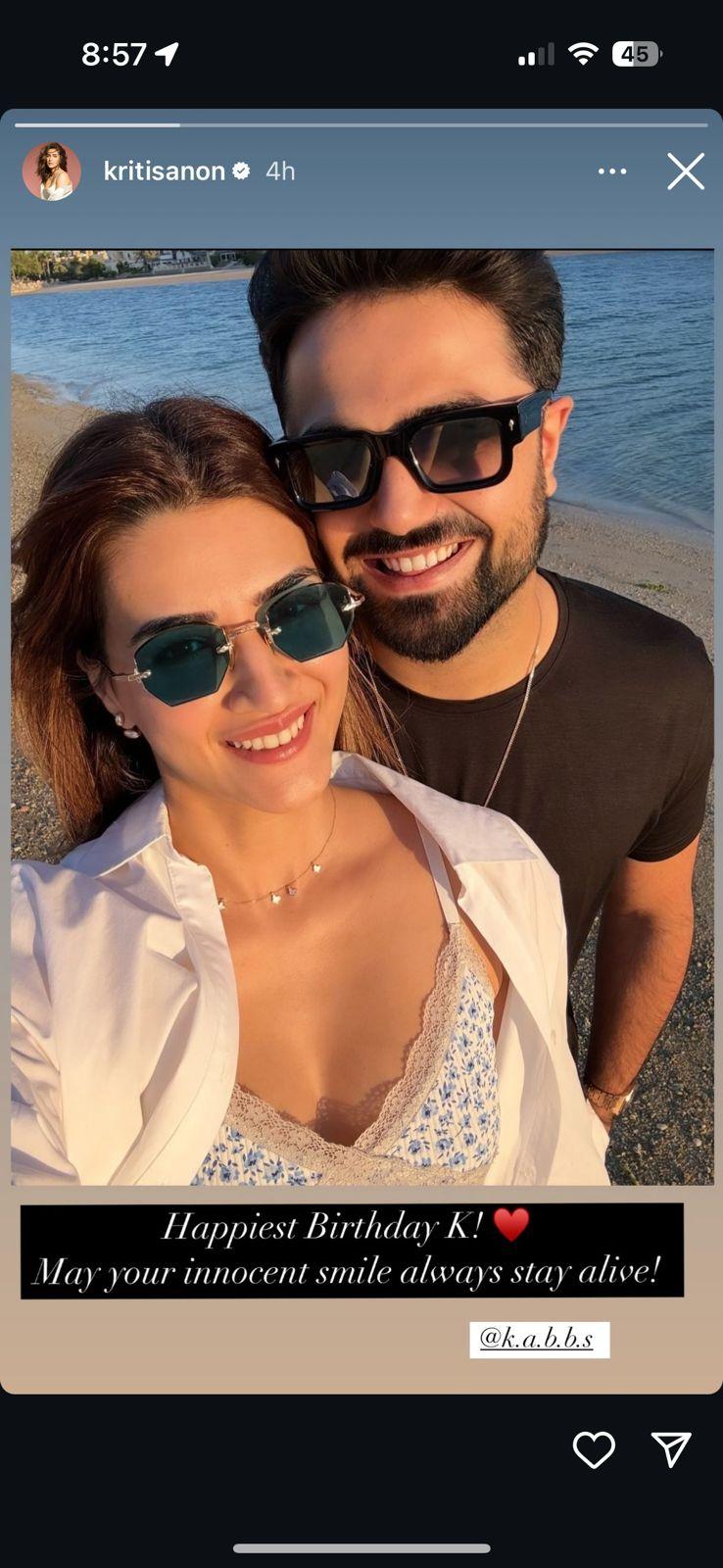 On Tuesday, Kriti took to Instagram Stories to share the special wish. In the picture, Kriti is seen standing close to Kabir in front of a beautiful beach backdrop. The actress looked happy in a white shirt paired with a white-and-blue bralette, while Kabir rocked a black T-shirt. “Happiest birthday, K! (red heart emoji) May your innocent smile always stay alive!" Kriti wrote while wishing her rumoured boyfriend.