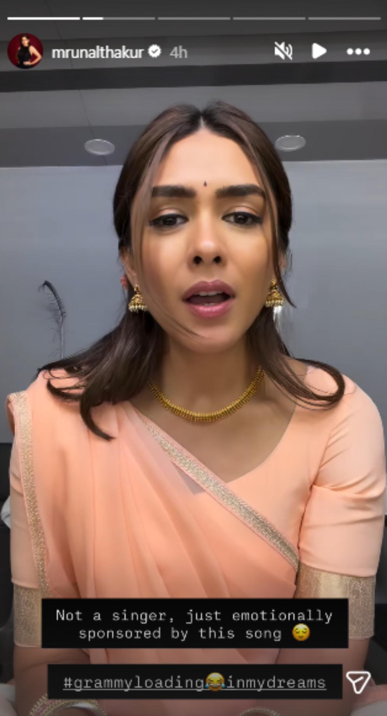Taking to the Stories section of her official Instagram account, Mrunal added the text, "Not a singer, just emotionally sponsored by this song".