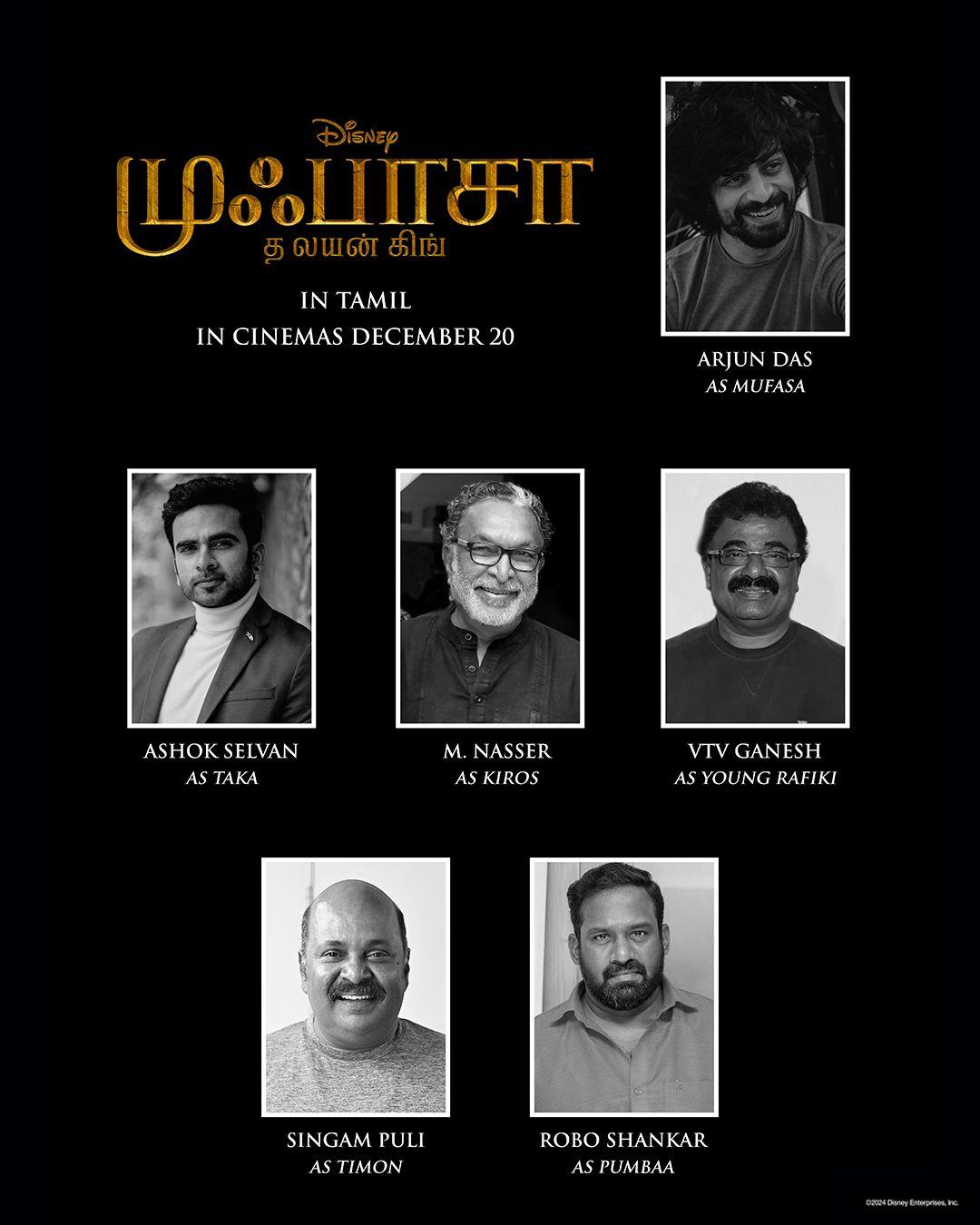 'Mufasa: The Lion King' (Tamil) will see Arjun Das as 'Mufasa', Ashok Selvan as 'Taka', Robo Shankar as 'Pumbaa', Singam Puli as 'Timon', VTV Ganesh as 'young Rafiki' and M. Nasser as 'Kiros'.