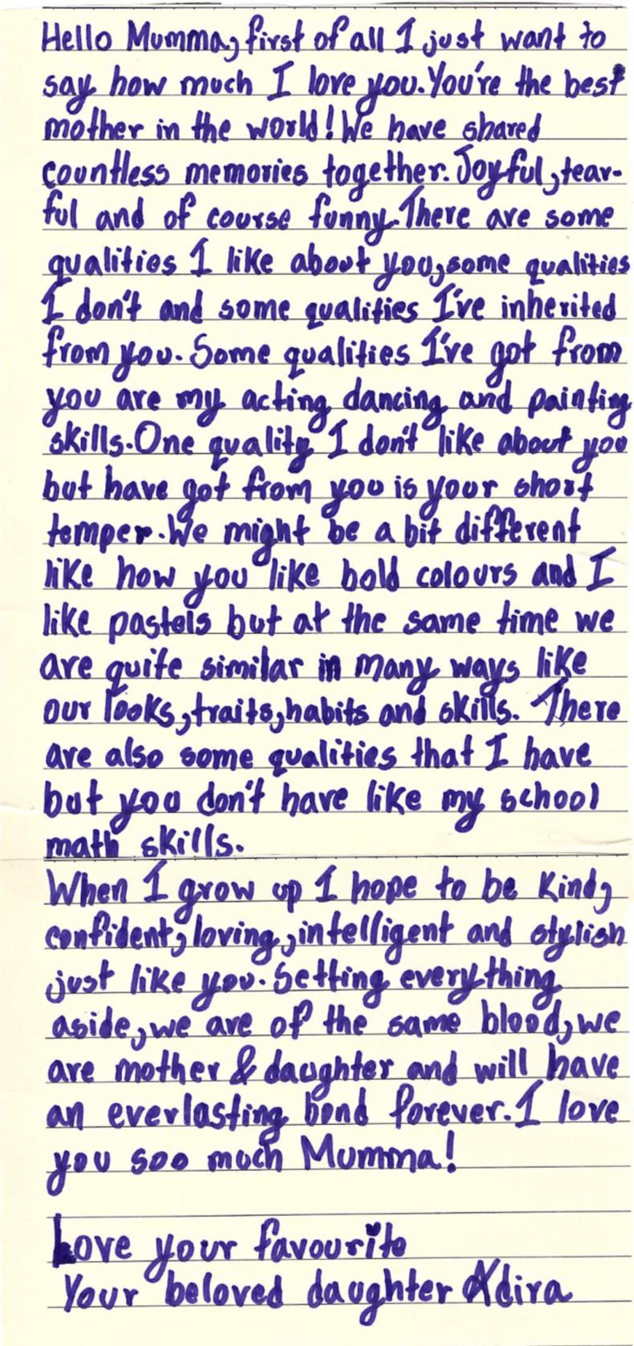 Adira also spoke about the qualities she both likes and dislikes in her mother. “There are some qualities I like about you, some qualities I don’t, and some qualities I’ve inherited from you. Some qualities I’ve got from you are my acting, dancing, and painting skills. One quality I don’t like about you, but have got from you, is your short temper. We might be a bit different like how you like bold colours and I like pastels but at the same time, we are quite similar in many ways, like our looks, traits, habits, and skills. There are also some qualities that I have but you don’t have, like my school math skills.”