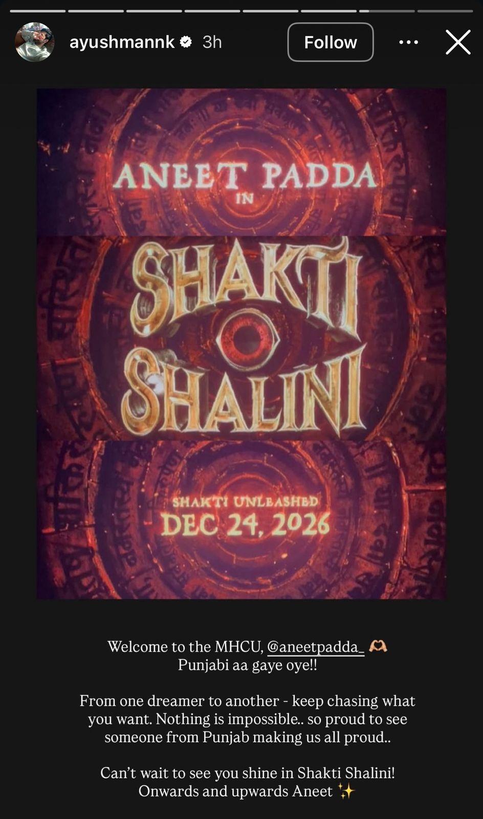 Ayushmann took to his Instagram stories to congratulate and officially welcome Saiyaara star Aneet Padda into the MHCU with Shakti Shalini. The announcement was revealed as part of Thamma’s end credits. He posted the clip on his Instagram story and wrote: “Welcome to the MHCU, aneetpadda… Punjabi aa gaye oye!! From one dreamer to another... keep chasing what you want. Nothing is impossible. So proud to see someone from Punjab making us all proud. Can’t wait to see you shine in Shakti Shalini! Onwards and upwards, Aneet.”