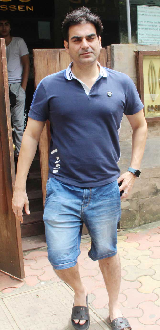 Arbaaz Khan, Giorgia Andriani and Arhaan Khan at a popular restaurant in Bandra, Mumbai. The actor opted for a blue polo neck t-shirt, paired with black sliders for the outing. All pictures/Yogen Shah