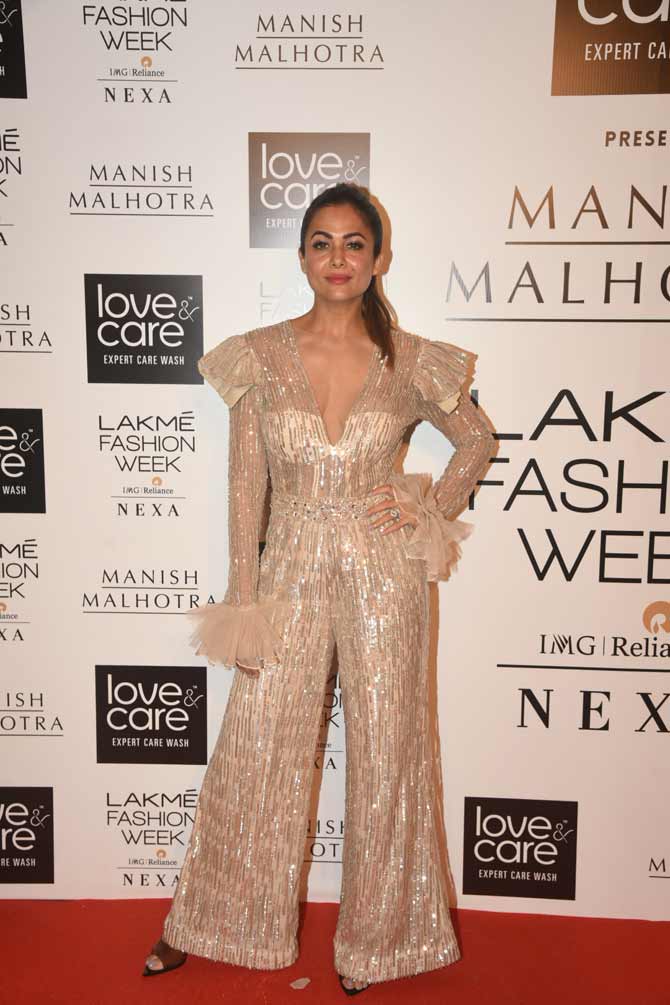 In picture: Amrita Arora's beige coloured sequinned jumpsuit won hearts at the Lakme Fashion Week Winter/Festive.