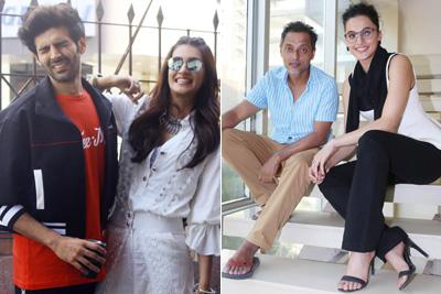 (L to R) Laxman Utekar, Kartik Aaryan, Kriti Sanon and Dinesh Vijan were spotted promoting their film Luka Chuppi in Andheri, Mumbai. All pictures/Yogen Shah