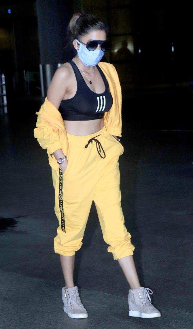 Tina Dattaa posed for the shutterbugs when snapped at the Mumbai airport. The actress was seen wearing a yellow coloured joggers suit during the outing.