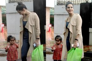 Sunny Leone was snapped with daughter Nisha Kaur Weber were clicked in Juhu, Mumbai. Nisha looked adorable in her striped baby dress, paired with baby pants and pink gumboots for the outing. Her wave and smile are already winning the internet. All pictures/Yogen Shah
