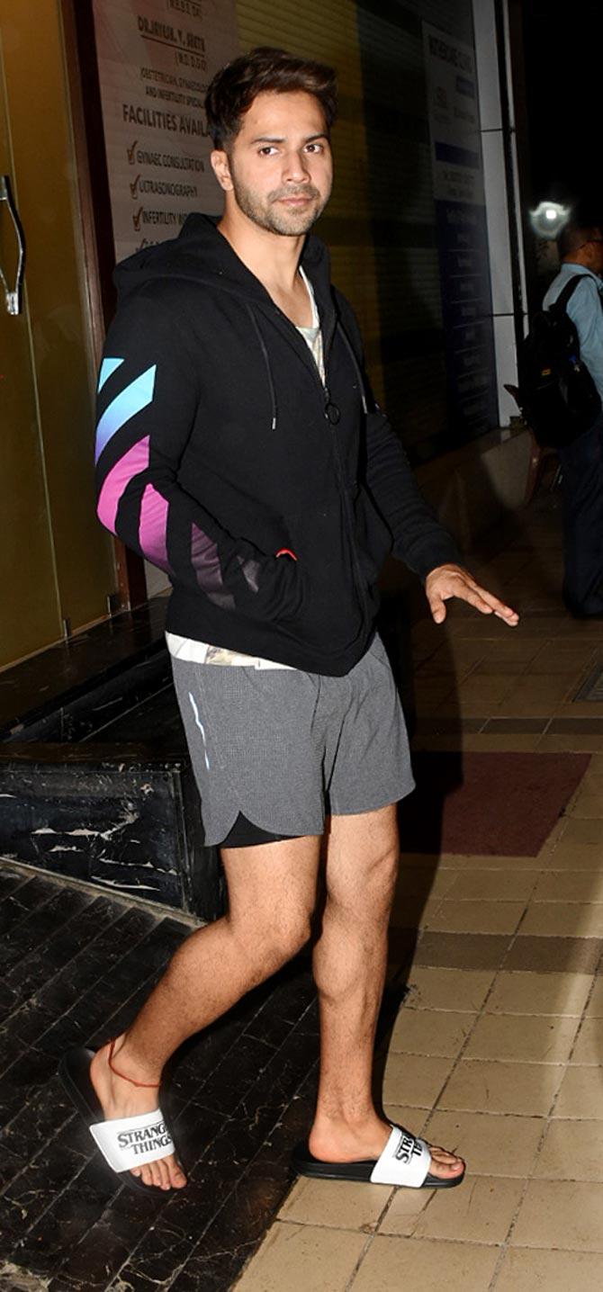 (In Pic: Varun Dhawan, sporting a white t-shirt, grey shorts, and a soulful black jacket is posing for photographs)