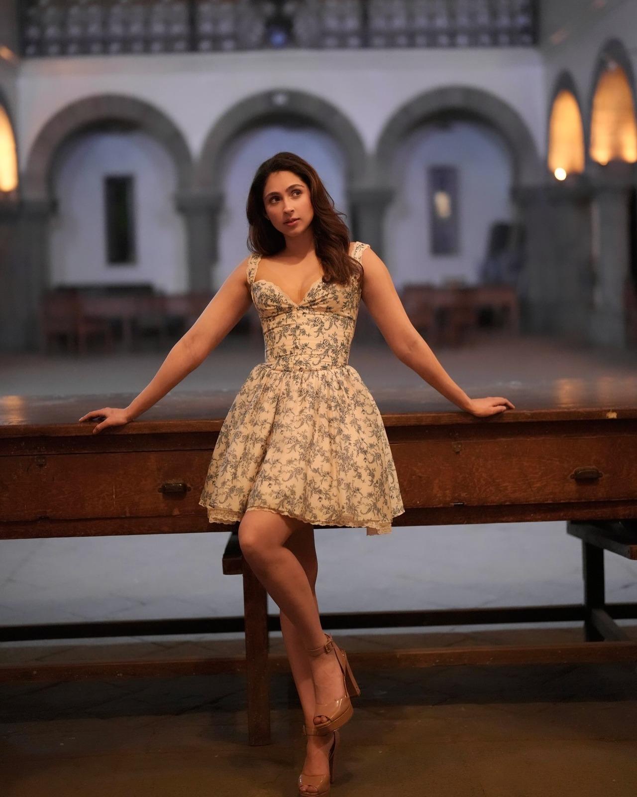 Effortlessly stylish, Pashmina keeps it minimal in this pick two-piece co-ord set featuring a long-sleeved sweetheart blouse and a high waist skirt with a thigh-high skirt. She pairs it with a pair of heels.