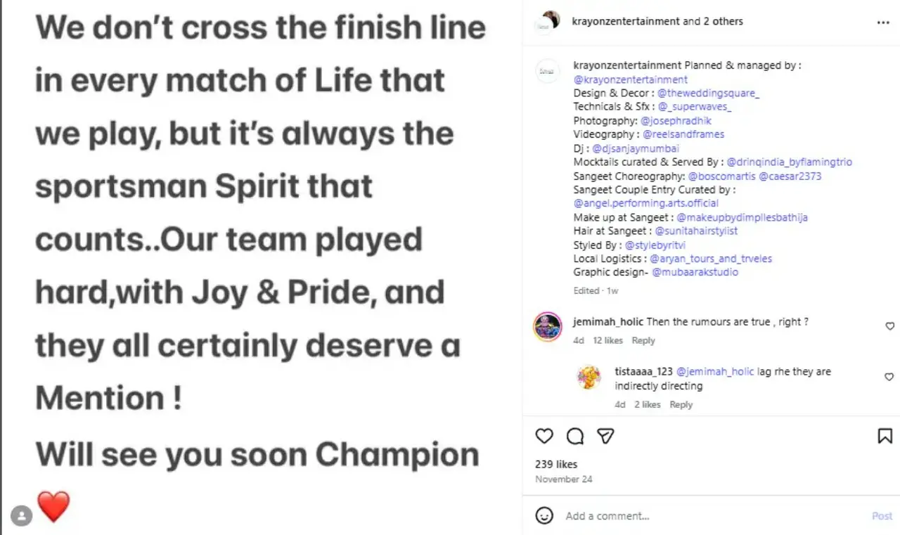 Soon, Reddit users began claiming that Palaash cheated on Smriti with a choreographer the night before the wedding. Following the chatter, Smriti deleted all her wedding and engagement posts on Instagram, which led netizens to believe that the cheating rumours may be true.