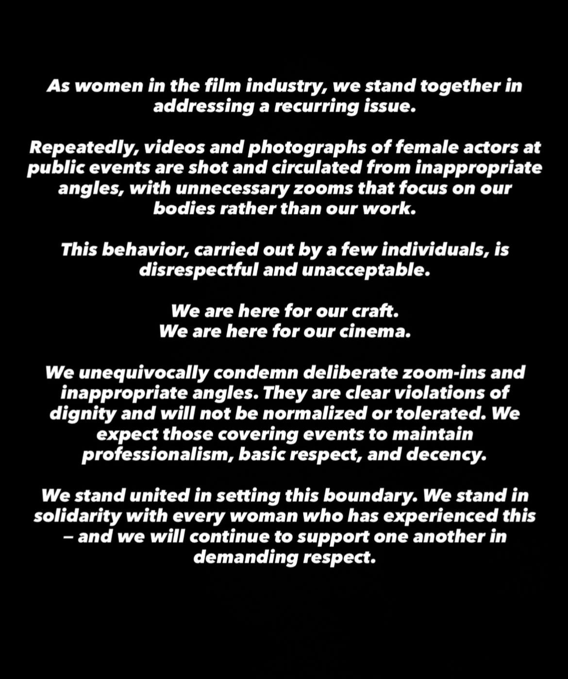 She added, “We are here for our craft. We are here for our cinema. We unequivocally condemn deliberate zoom-ins and inappropriate angles. They are clear violations of dignity and will not be normalized or tolerated. We expect those covering events to maintain professionalism, basic respect, and decency.”