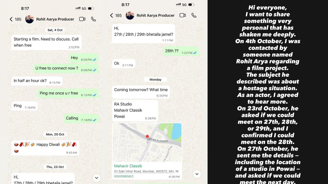 She stated that Arya continued to message her for several weeks. On October 23, he requested that she see him in a studio on October 27, 28, or 29. Jadhav agreed to meet on October 28, and Arya later texted her the location, RA Studio in Powai, where the hostage crisis later occurred.