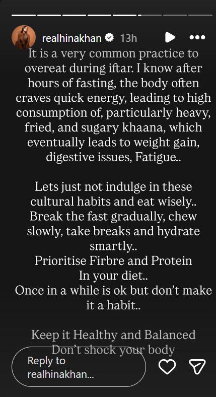 Taking to her official Instagram Stories, the Yeh Rishta Kya Kehlata Hai actress wrote, “It is a very common practice to overeat during iftar. I know after hours of fasting, the body often craves quick energy, leading to high consumption of particularly heavy, fried, and sugary khaana, which eventually leads to weight gain, digestive issues, fatigue..(sic).”