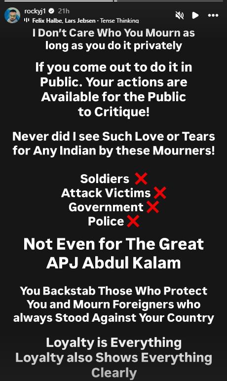 Taking to his Instagram story on Monday, March 2, Rocky penned a strong-worded note that read, "Never did I see such love or tears for any Indian by these mourners! Soldiers, attack victims, government police, not even for the great APJ Abdul Kalam. You backstab those who protect you and mourn foreigners who always stood against your country. Loyalty is everything. Loyalty also shows everything clearly."