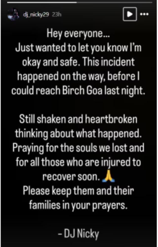 DJ Nicky, who was supposed to perform at the Goa nightclub, the night the fire claimed 25 lives and injured several others, took to Instagram to share her emotions