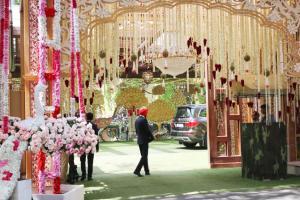 At the entrance of Antilia, a grand chandelier can be seen hanging with a string of lights around it. The trees can be seen covered with pink and flowers There are two floral peacock decor that are mesmerising