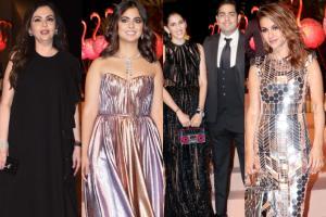 Isha Ambani donned a copper and silver off-shoulder gown with a sweetheart neckline and it stood out for its metallic hues. Isha carried off smokey-eyes and a statement necklace. Bollywood actor Shah Rukh Khan's wife, Gauri Khan, was seen in a polka-dot top and black pants.