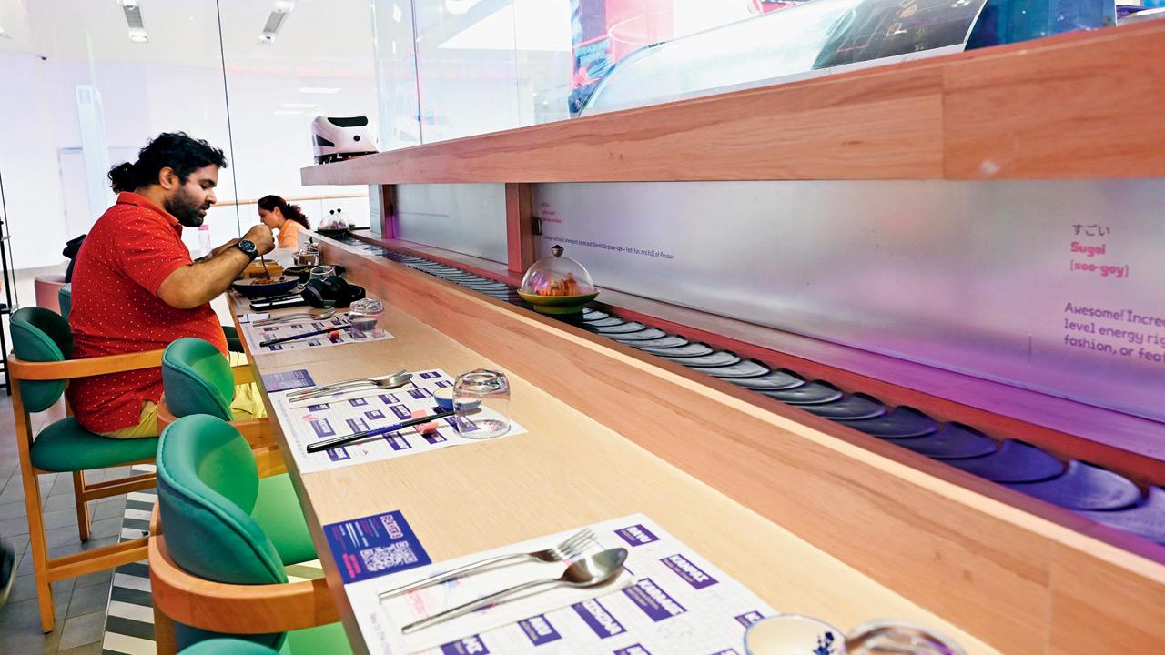 A diner sits by the sushi conveyor belt. PICS/SATEJ SHINDE