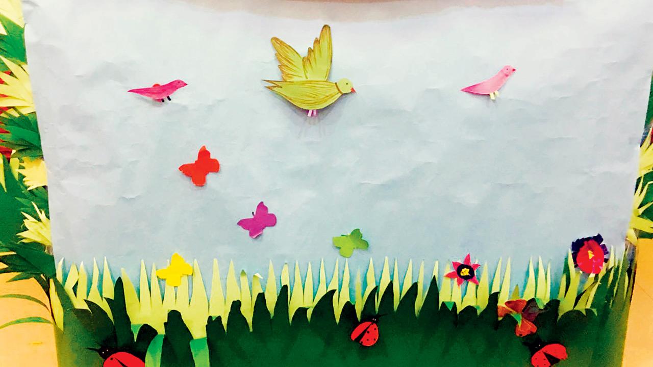 A nature-themed decor set-up by Sharma, including a tree and birds made from crepe paper and newspapers