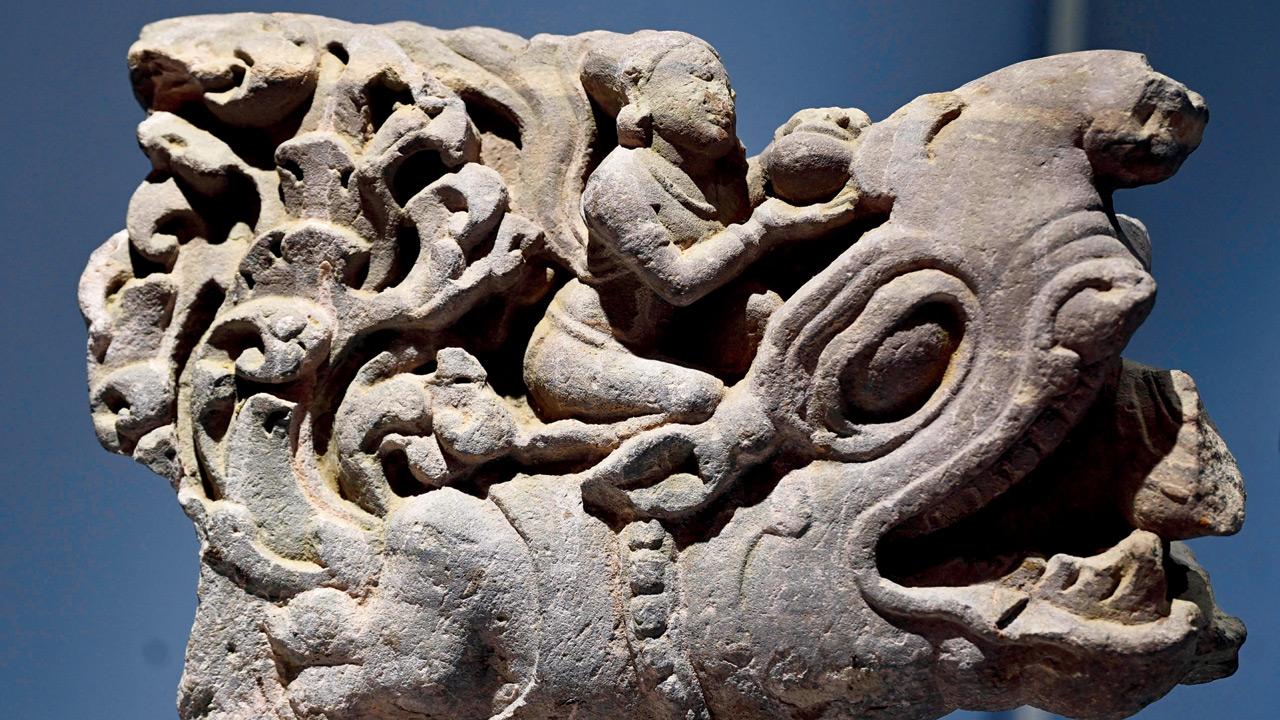 This sandstone carving hails from Central Indian plains. Probably part of an ornamental arch, it depicts the goddess Ganga riding a makara.