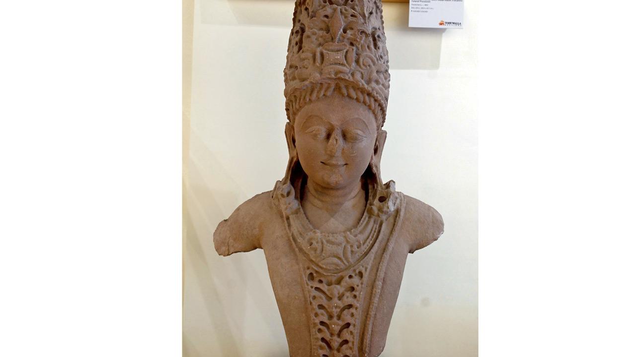 This large sandstone bust is decked with ornately carved tiara and necklace. Pointing to the two and half feet tall bust, Todywalla remarks, “Imagine the size of the entire standing statue.”
