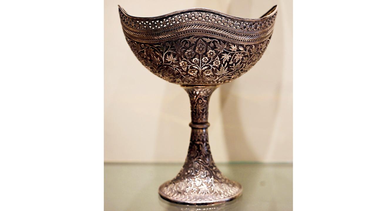 Ornate, and in kashkul form, “the etching of the leaves of the Chinar tree on the bowl are a running motif in silver from Kashmir,” Todywalla reveals.