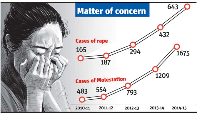 Molestation incidences, meanwhile, have risen to 347 per cent as compared to 2010-11, which saw 483 cases. This year, with a total of 1,675 cases registered, female citizens were at three times more risk of being sexually harassed.