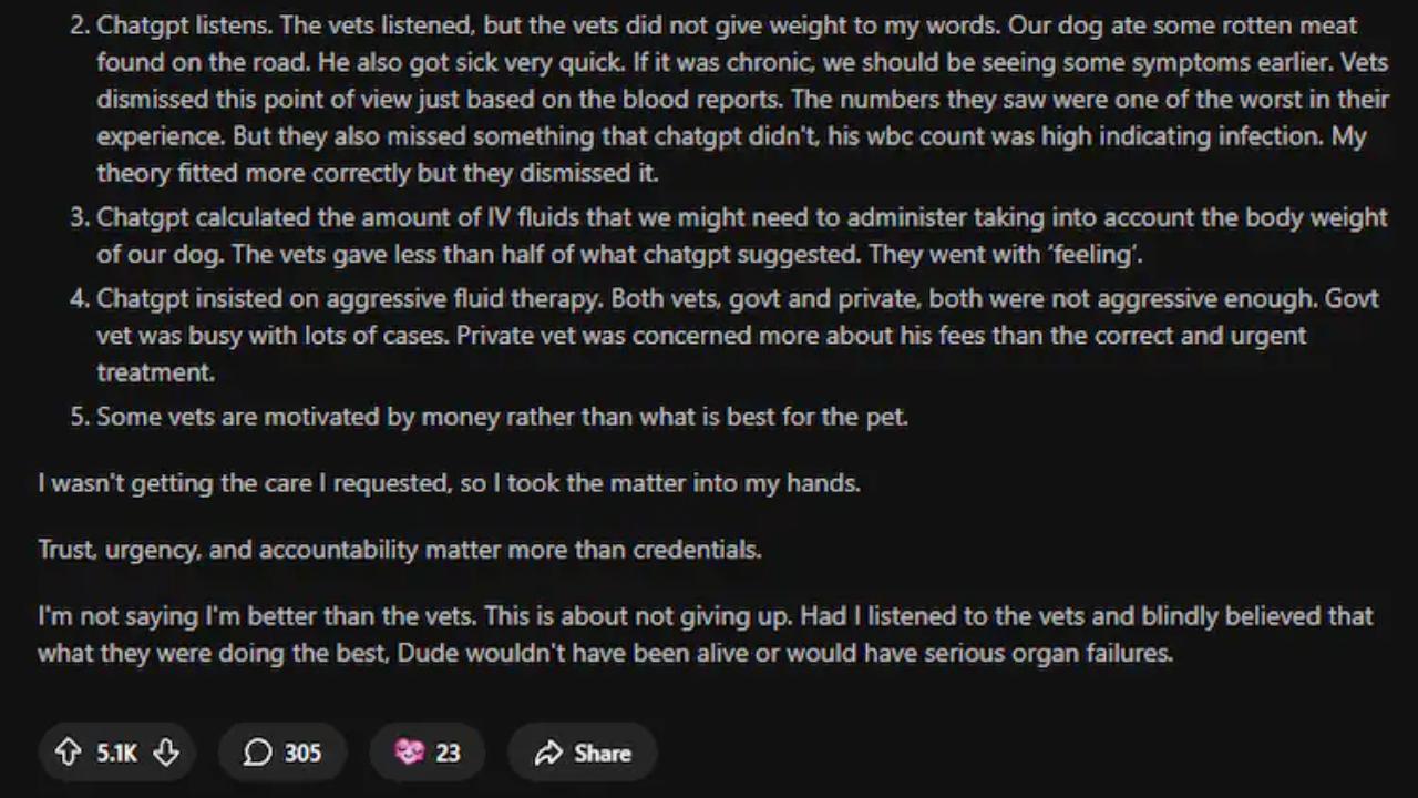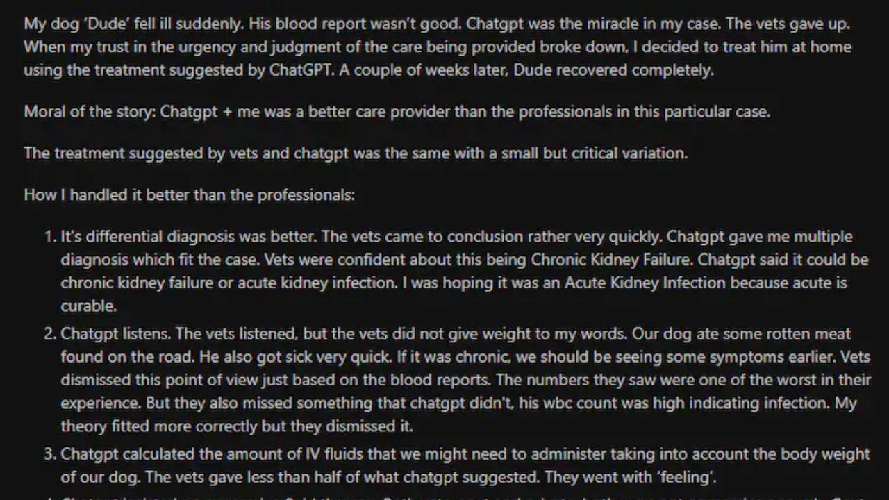 According to the post, ChatGPT also calculated the required amount of intravenous fluids based on the dog’s body weight, recommending a much higher dose than what was being given.
