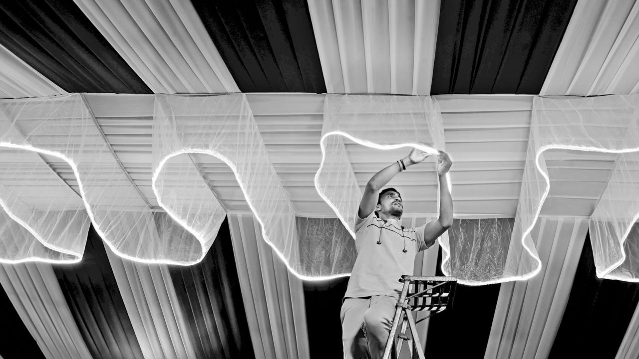 An electrician sets up decorative lights at a Ganesh pandal in Borivli West. PIC/NIMESH DAVE