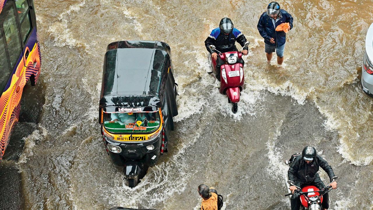 Bikes, autos, and citizens navigate a flooded Andheri Kurla Road under the Gundavli Metro station. PIC/RANE ASHISH