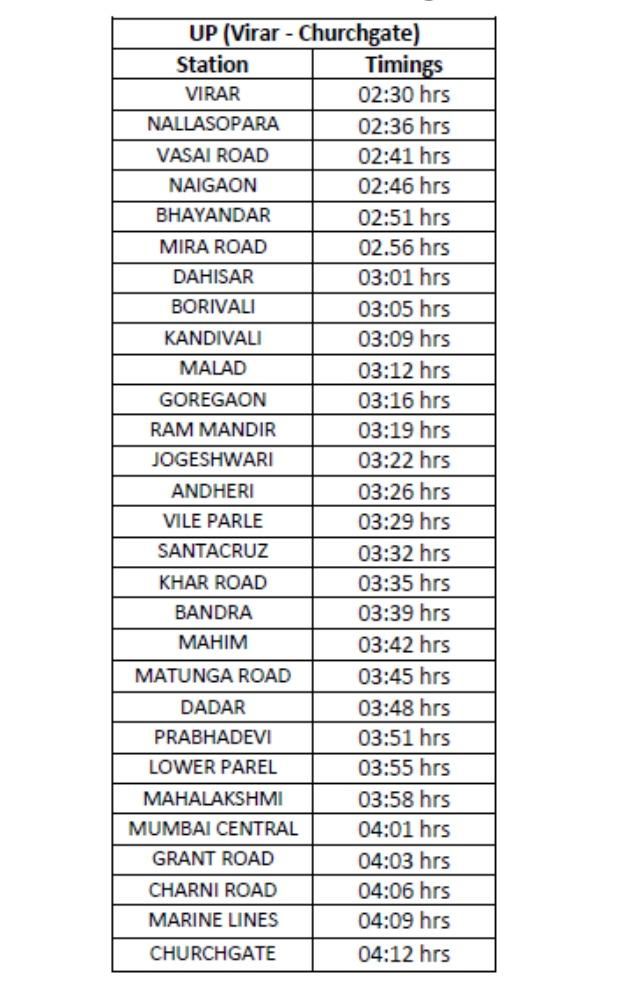 The special service will leave Virar at 02:30 am and is scheduled to reach Churchgate at 04:12 am.
