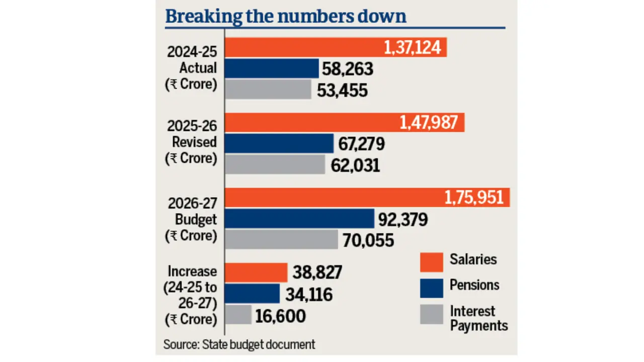 More than half of Maharashtra’s revenue income will go towards fixed commitments in the 2026–27 budget, with salaries of government employees, pensions for retired staff and interest payments on loans together accounting for about Rs 3,38,385 crore.