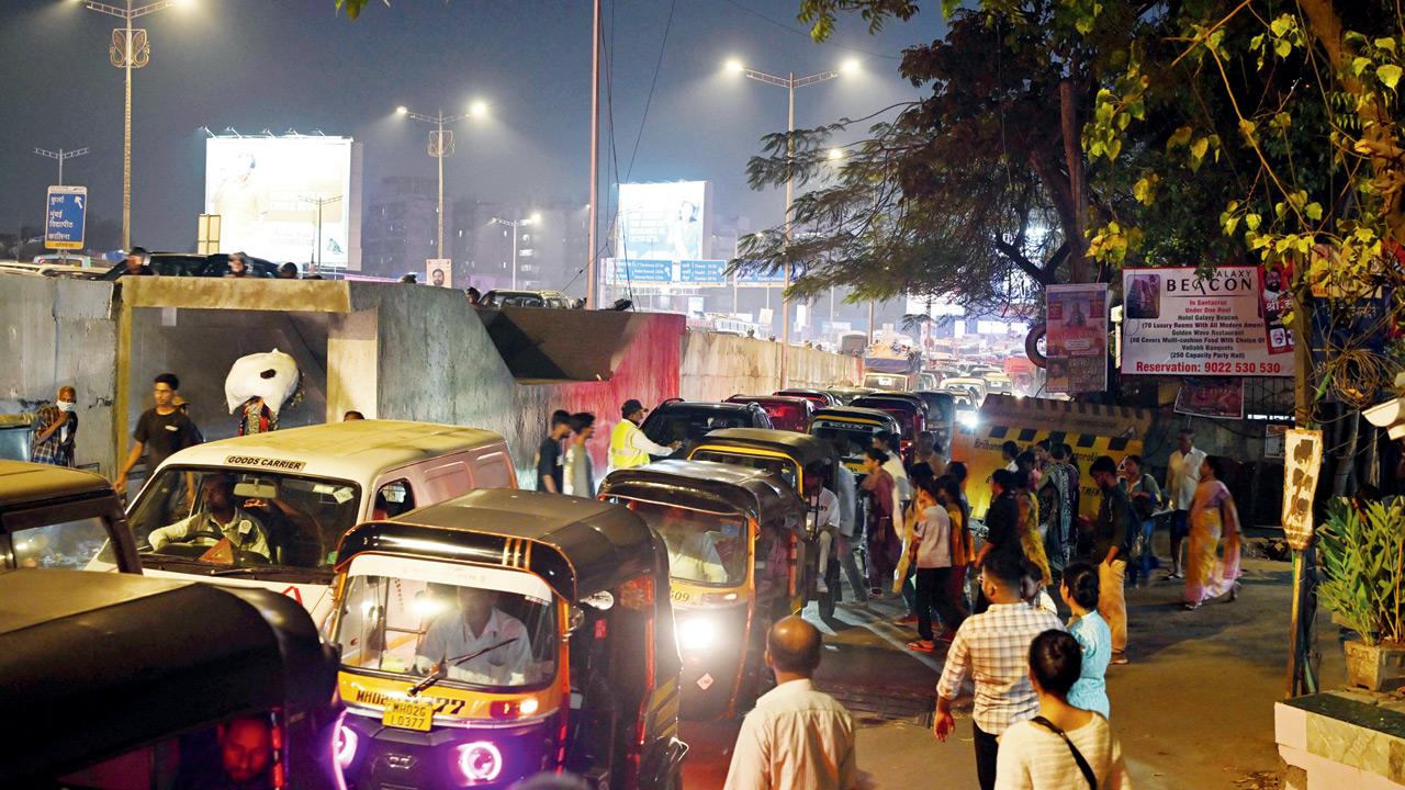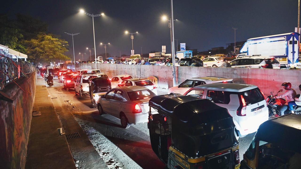 The Milan Subway service road is choked during evening peak hours due to the narrowing of a lane on the northbound Western Express Highway in Santacruz East on Tuesday. Pics/Satej Shinde
