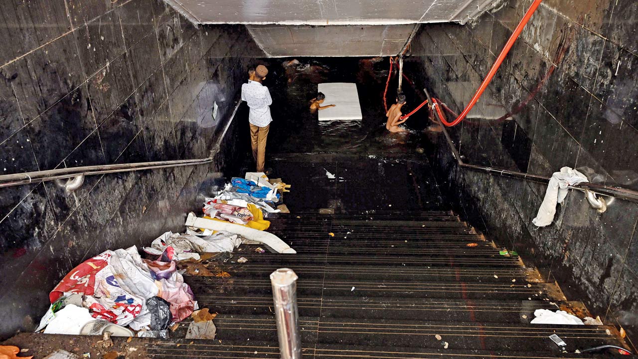 A pedestrian underpass at Kherwadi, Bandra East, along the Western Express Highway has been shut for a long time. But, if you take a peep inside, you will find a bunch of children enjoying a swim in the water that has accummulated there during the monsoon.