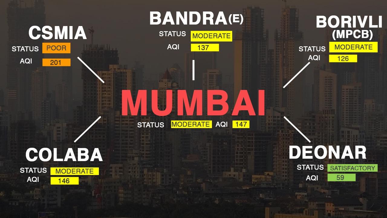 Mumbai’s air quality, on Thursday, fell under the “moderate” category with an AQI of 147, according to aqi.in.